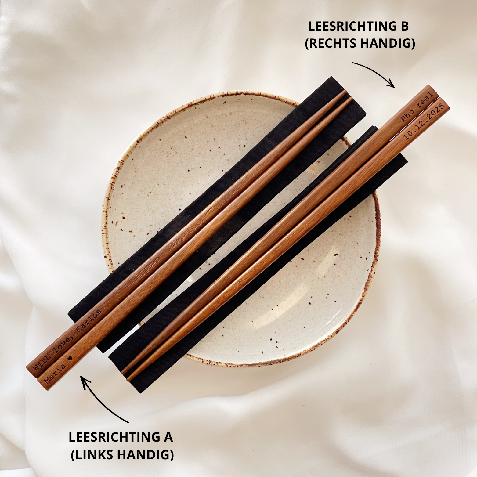 Het is mogelijk om de eetstokjes te bestellen voor rechtshandige gebruikers (leeswijze B) of linkshandige gebruikers (leeswijze A).
