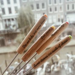 Deze houten fondue vorkjes zijn te personaliseren met je eigen korte tekst of naam.